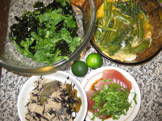 、、ってやってるうちに、ご飯が炊けた~!!たまにはこーゆうのも、うれしいよね!料理は大体3分で仕事の合間にやる。スナップえんどうと春菊の茎の卵とじ。ビントロと野生の三つ葉。春菊と生ワカメのカボスと醤油和え。左下のごはんがおいしいのよ、炊く寸前でもOK,ひじきを乾燥のまま入れちゃう。なので水は多め。あと、ビワ茶と海の素1~2滴、根昆布で炊いた。歯がないから、、それにおいしいから、胚芽白米にキンワともちキビ入りでモッチモチ。炊きたてキャッホー!!(^^)!。。