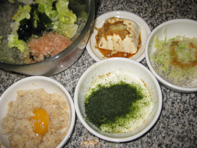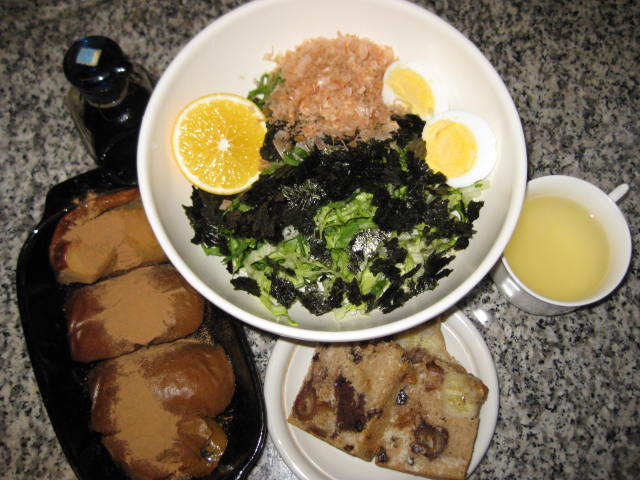 で、やっと本題の食です。こーゆうのは玄米を炊いたときで週に1回ぐらいかな。あるもんで作った夕食。卵はよく食べますね。とろろは醤油、大根おろしは醤油とレモンをたっぷり、奴は生姜醤油です。調味は大体はレモンと醤油。もう充分満足でおいしい!せっかくの野菜にドレッシングはダメですね。たとえ植物性の自然食品で買うドレッシングも大体はアウト、酢や油の混ざったのは酸化ですから。。