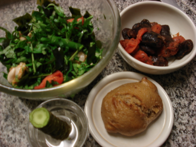 で、夕食はいつもこんなもん。同じもんの方がカラダが調子いいみたいよ。。軽井沢花豆はトマトと塩とバジルの味付け。サラダは今日は特別で、ベビーホタテ入りのごちそう!パンは全粒100%のアンズ&プルーンのプチを1個。冷凍のをふかふかに蒸したの。あと煮出したどくだみ茶。。ごはんはほとんど食べない。。外食でおさしみ定食や焼魚くらいかな。魚も汚染が怖い。(中国から注射針や農薬の袋なんかが沖縄に流れ着いてるらしい)。。東北に胃ガンが多いらしいけど、それってご飯食が原因じゃないのかな?漬物で山盛り食べちゃうのが酸毒になるんでしょ。白米の食べすぎと漬物の塩の酸化かな。あと、田舎の人ってお菓子もよく食べるよね。ワタシの場合、主食がこの山盛りの小松菜サラダだもん。。いくら食べても酸毒にはならないし、お菓子は全く食べたくない。